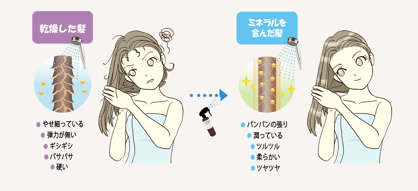 「マジミネ」の濃厚なミネラルが毛髪のたんぱく質に働きかけ水分を蓄えやすい状態になる…