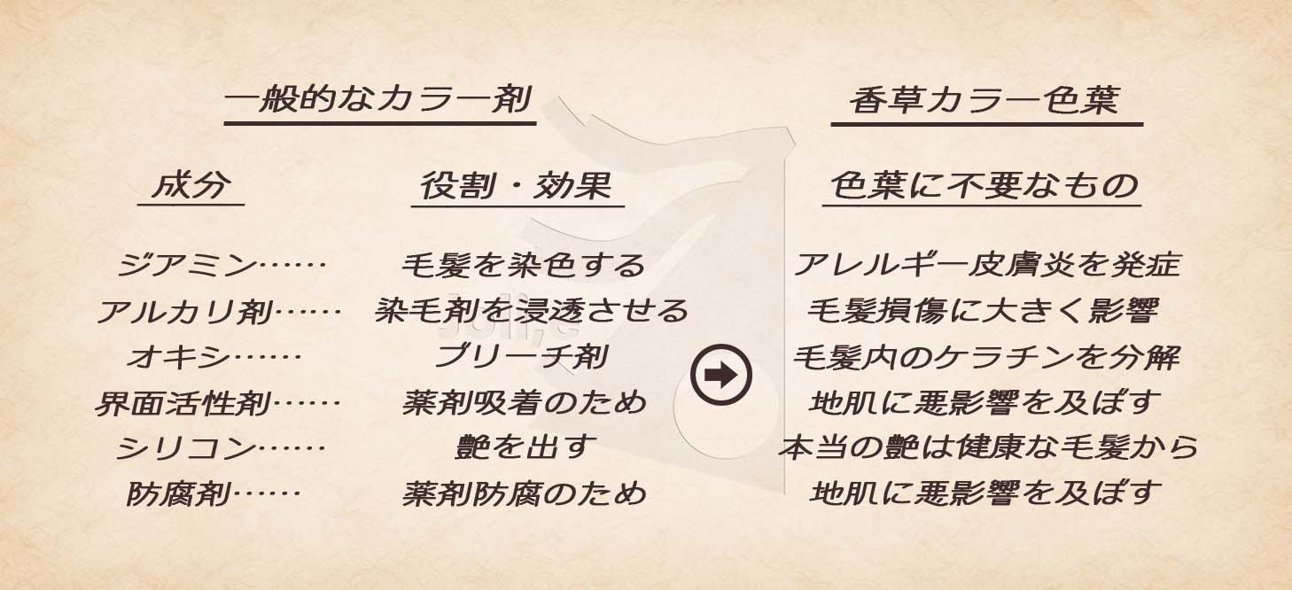 ジアミンアレルギーの原因「酸化染料」の配合やアルカリカラーに必要な成分を一切省き、染めるほどにハリやコシ、艶を出し髪を健康へと導きます