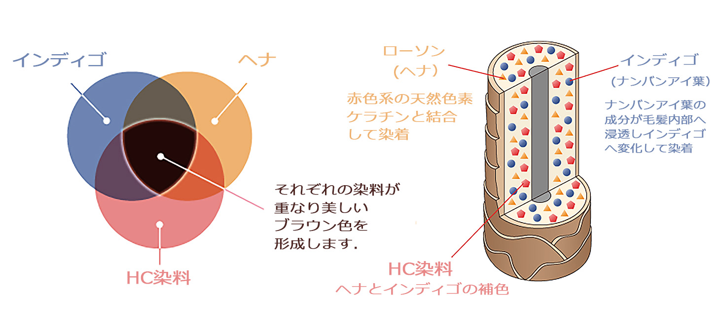 天然植物成分(ローソン、インディゴ)が毛髪のケラチンと結びつきしっかりとした染毛を実現